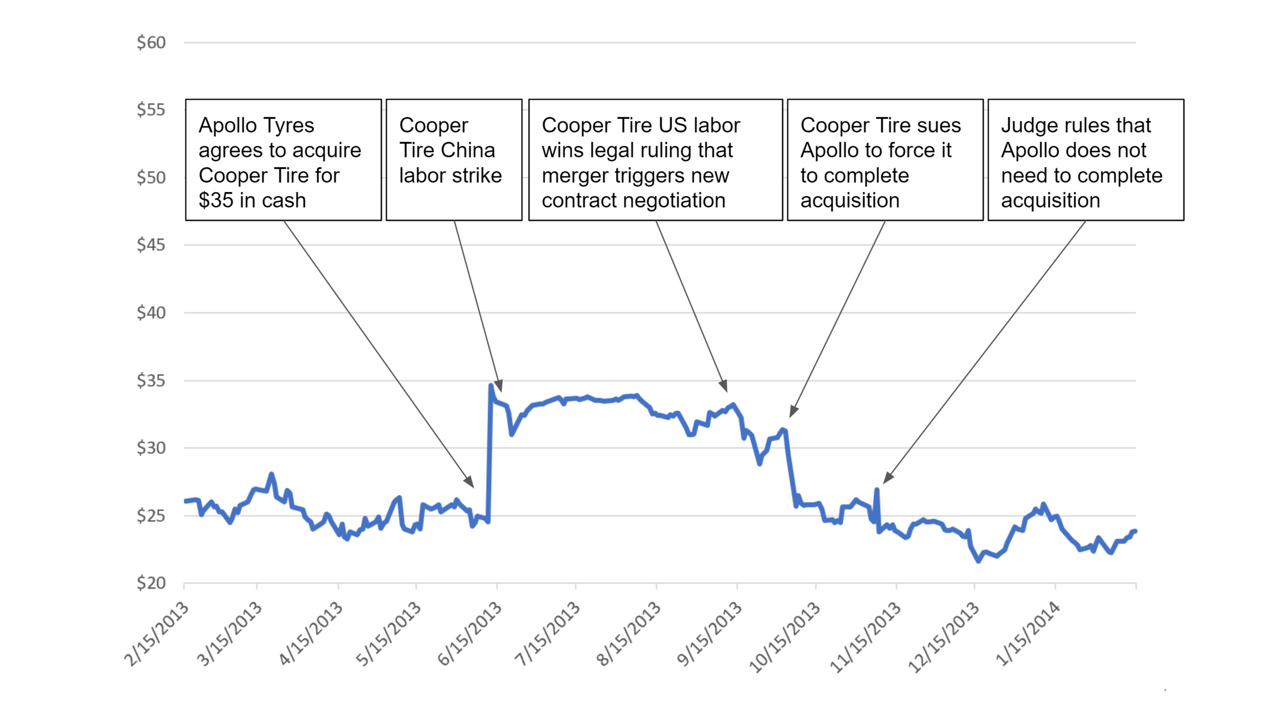 We can see this ongoing re-pricing in stock price charts of merger targets as new stories change investors’ reduction to probabilities: