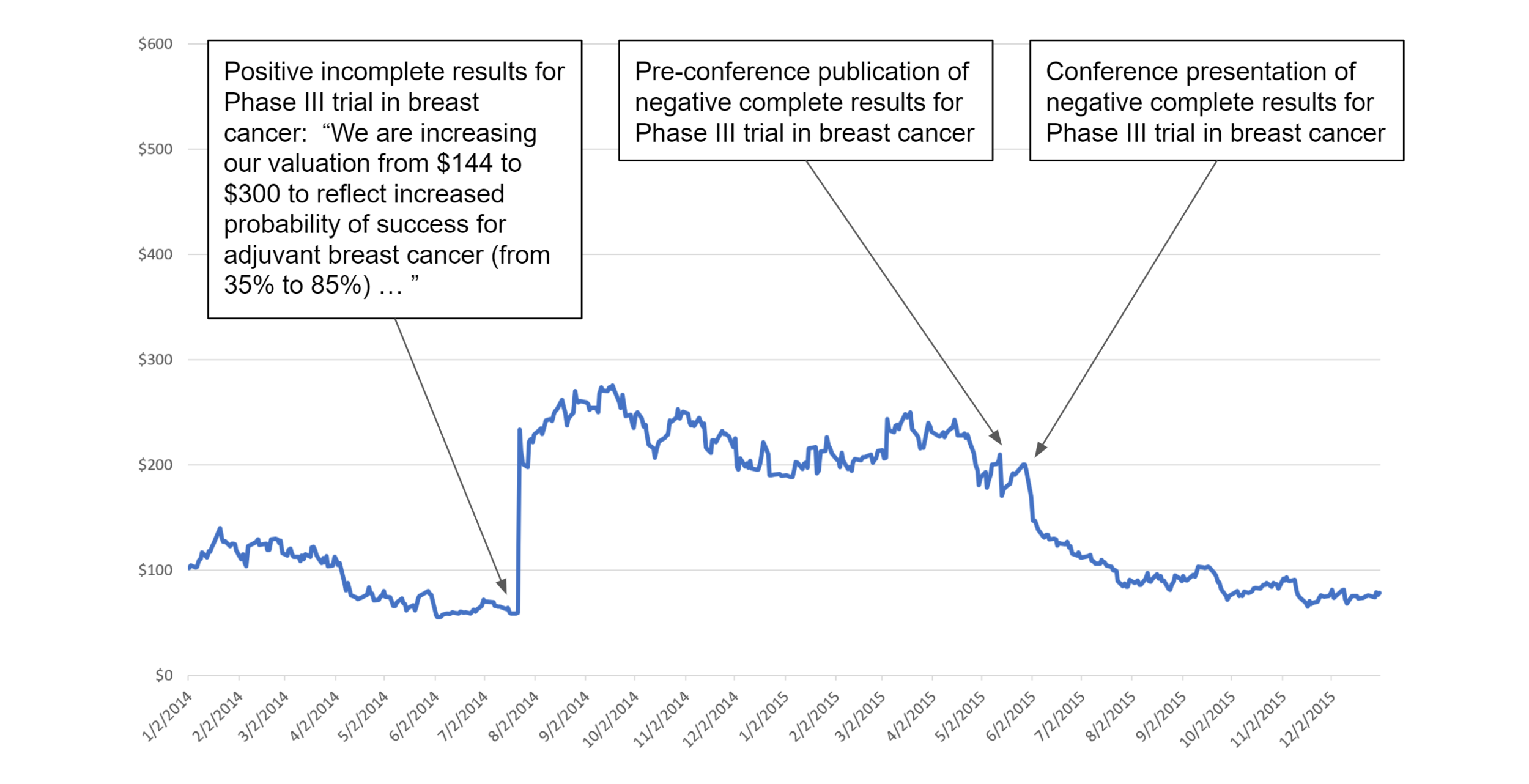 Like event-driven investors, some biotech investors write price targets explicitly based on their probability of the success of future events. Below, the “Probability-adjustment” of 18% is for the odds of regulatory approval of a company’s drug: