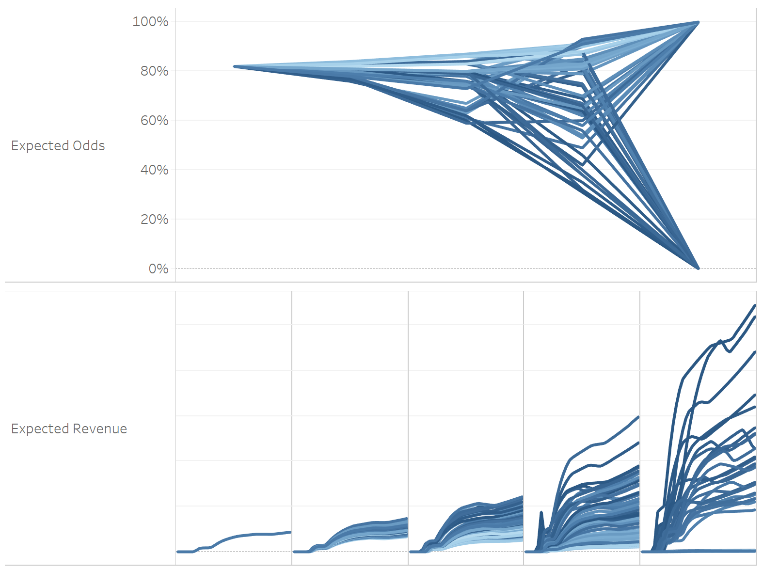 Below, click on one of the best cases for expected revenue in the lower right to see how it is driven by a case for the change over time in investors’ odds for value proposition strength in each of virtualgoods.shop’s target markets (if you are reading on a smartphone, flipping to landscape mode helps with the interactive charts below):